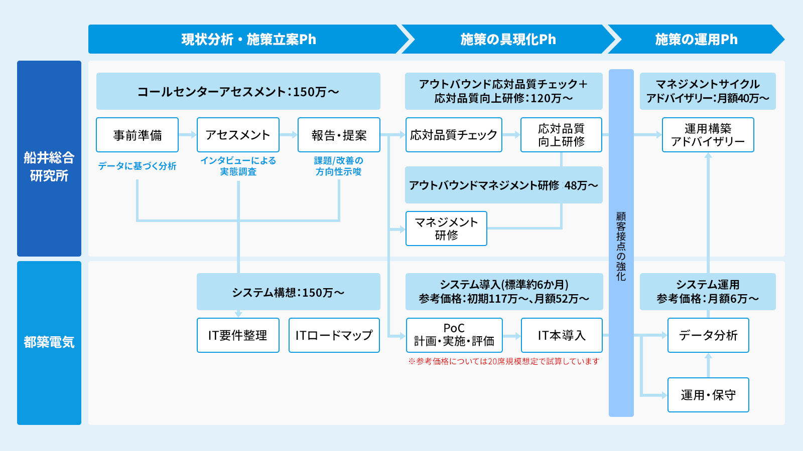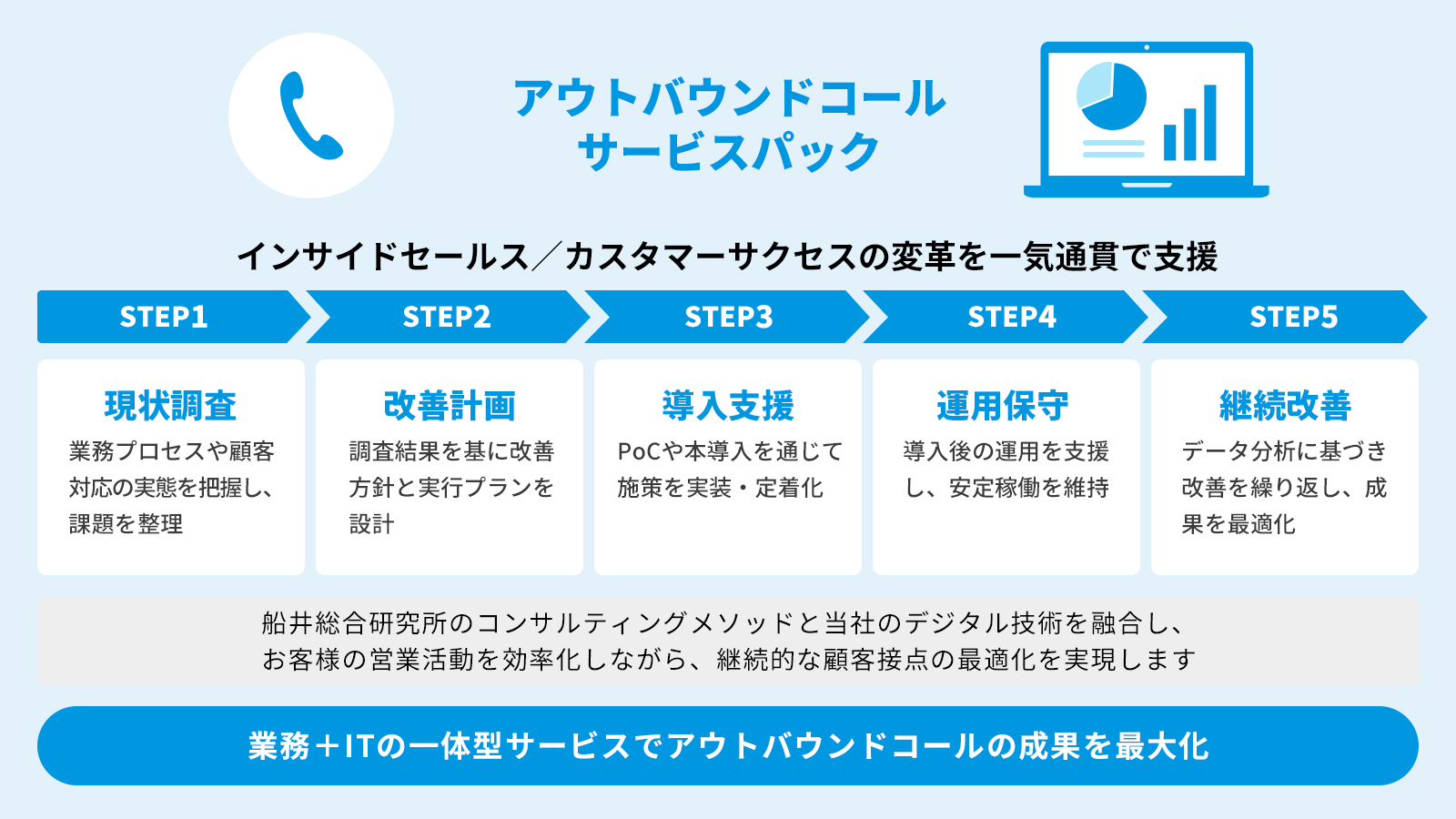 船井総合研究所プロシード事業部のコンサルティングメソッドと当社のデジタル技術を掛け合わせたオファリングサービスにより、課題の特定・整理から、改善計画の立案、必要なデジタル施策の導入支援(PoC、本導入)、運用保守およびデータ分析、継続改善支援まで、お客様におけるインサイドセールス/カスタマーサクセスの変革を一気通貫で支援します。