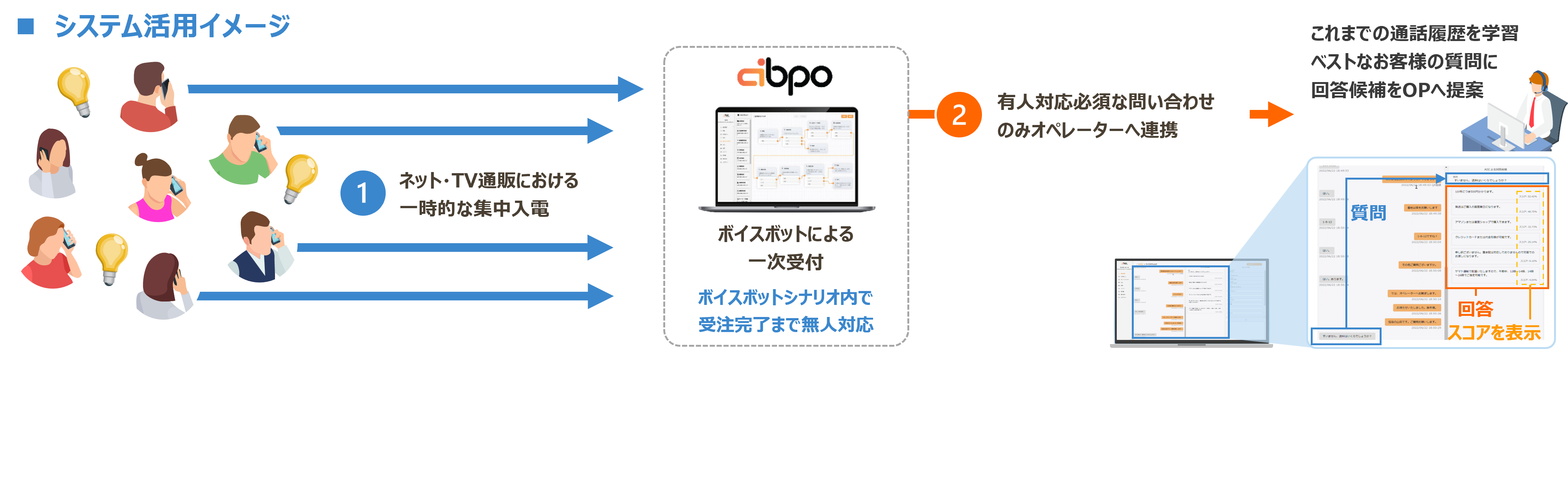 - お客様からの注文をボイスボットが100%対応、オペレーター逼迫時に発生する呼損